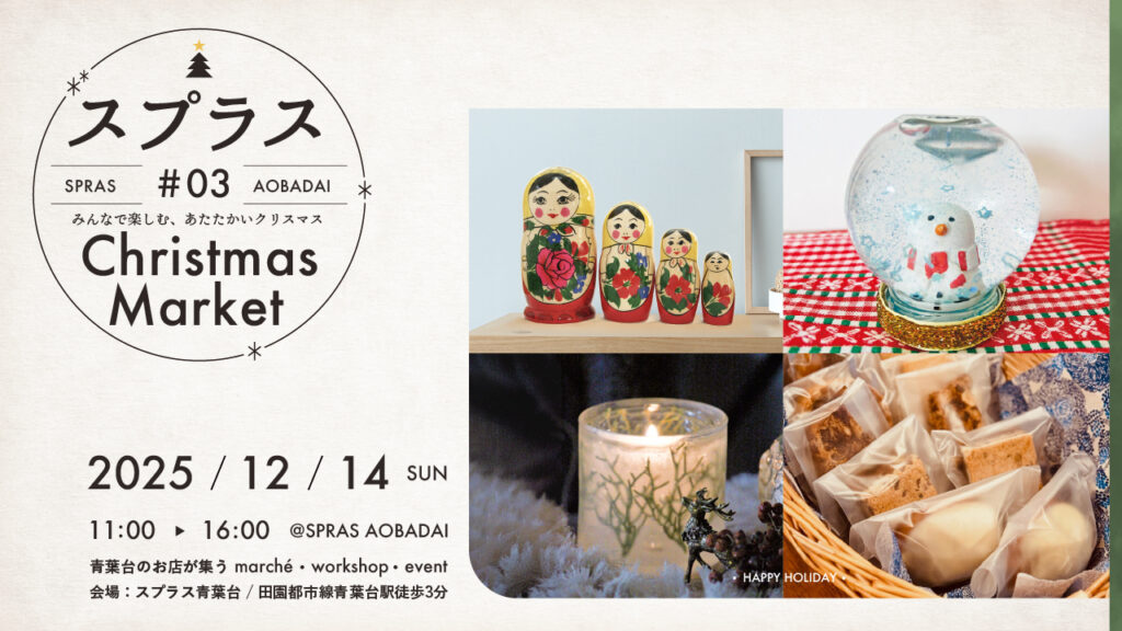 青葉台にある、コミュニティ&コワーキングスペース「SPRAS AOBADAI(スプラス青葉台)」が企画するクリスマスマーケットです。 もうすぐ待ちに待ったクリスマス!ということで、今年もスプラス青葉 … 続きを読む 12月14日(日)SPRAS AOBADAI Christmas Market # 3 出店者様のご紹介