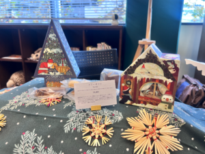 販売と並行して白木の材料に大人もこどもも、世界に一つだけのすてきなツリーのマトリョーシカを描ける