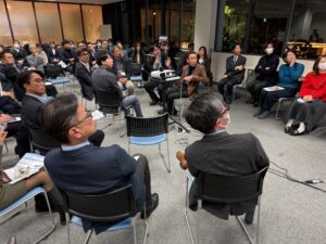 3社からそれぞれ挨拶の後は、三菱ケミカルから、果汁分析結果からみえてきた「浜なし」果汁のポテンシャルや、酵素反応による搾汁の改良や糖の増加に関する発表がありました。また、浜なしを取り巻く現状や浜なしワインの味、技術などに話題が広がりました。