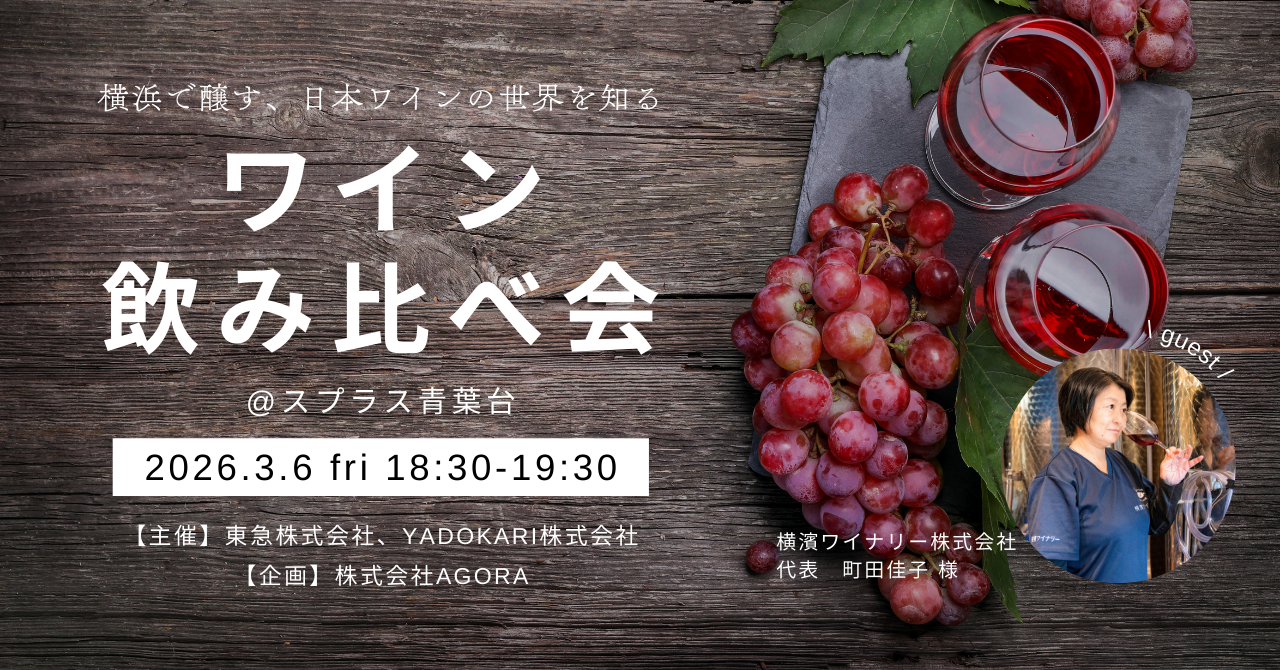 今回は地元横浜でワインを醸造する横濱ワイナリー様をお迎えして、ワインの飲み比べ交流会を開催します。
